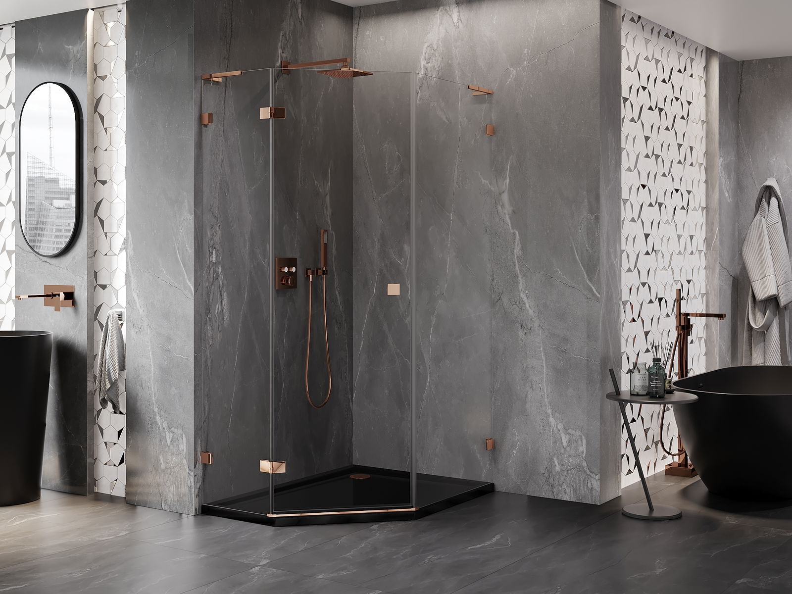D'Klammen an d'Héngelen goufen aus ganz dauerhafte Messing gemaach, an zousätzlech schafen se eng ausgeglachen Glasfläche. Et ass eng exzellent Wiel, déi Eleganz, Haltbarkeet an modernen Design verbënnt. Mat esou Léisunge gewënnt d'Dusch un Ästhetik, an gläichzäiteg erliichtert et d'Rengen.