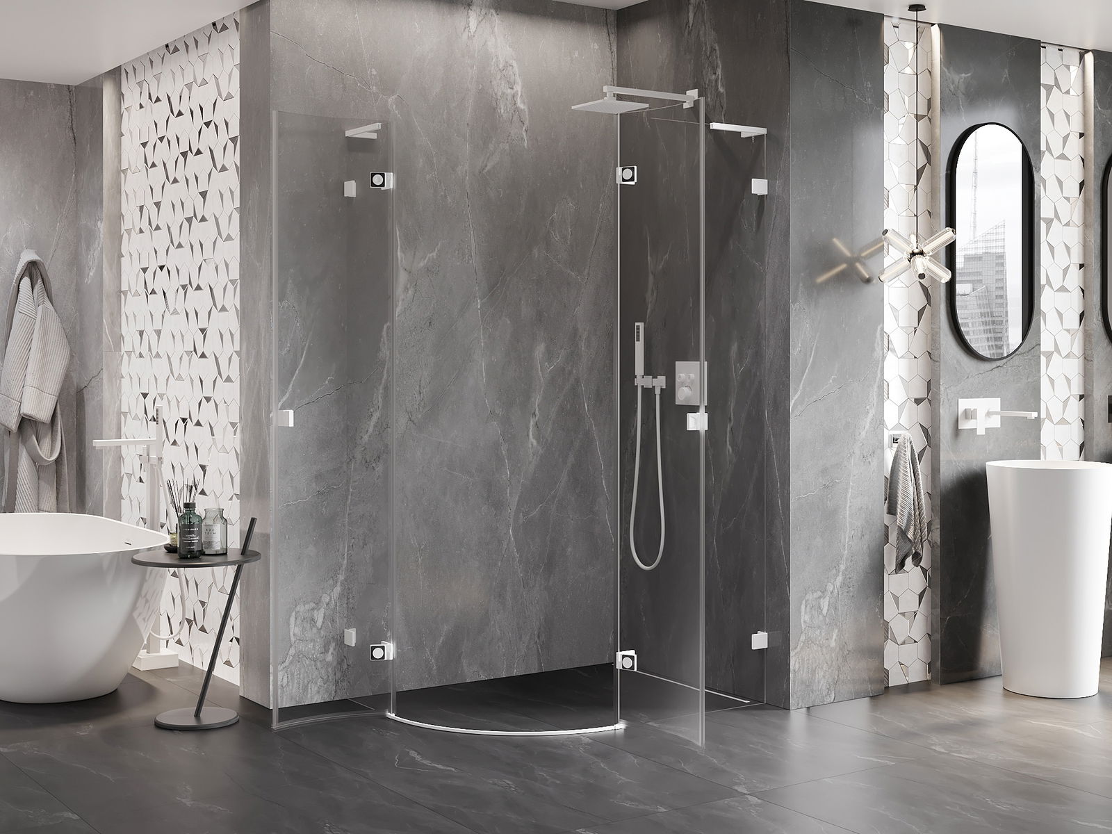 D'Klammen an d'Héngelen goufen aus ganz dauerhafte Messing gemaach, an zousätzlech schafen se eng ausgeglachen Glasfläche. Et ass eng exzellent Wiel, déi Eleganz, Haltbarkeet an modernen Design verbënnt. Mat esou Léisunge gewënnt d'Dusch un Ästhetik, an gläichzäiteg erliichtert et d'Rengen.