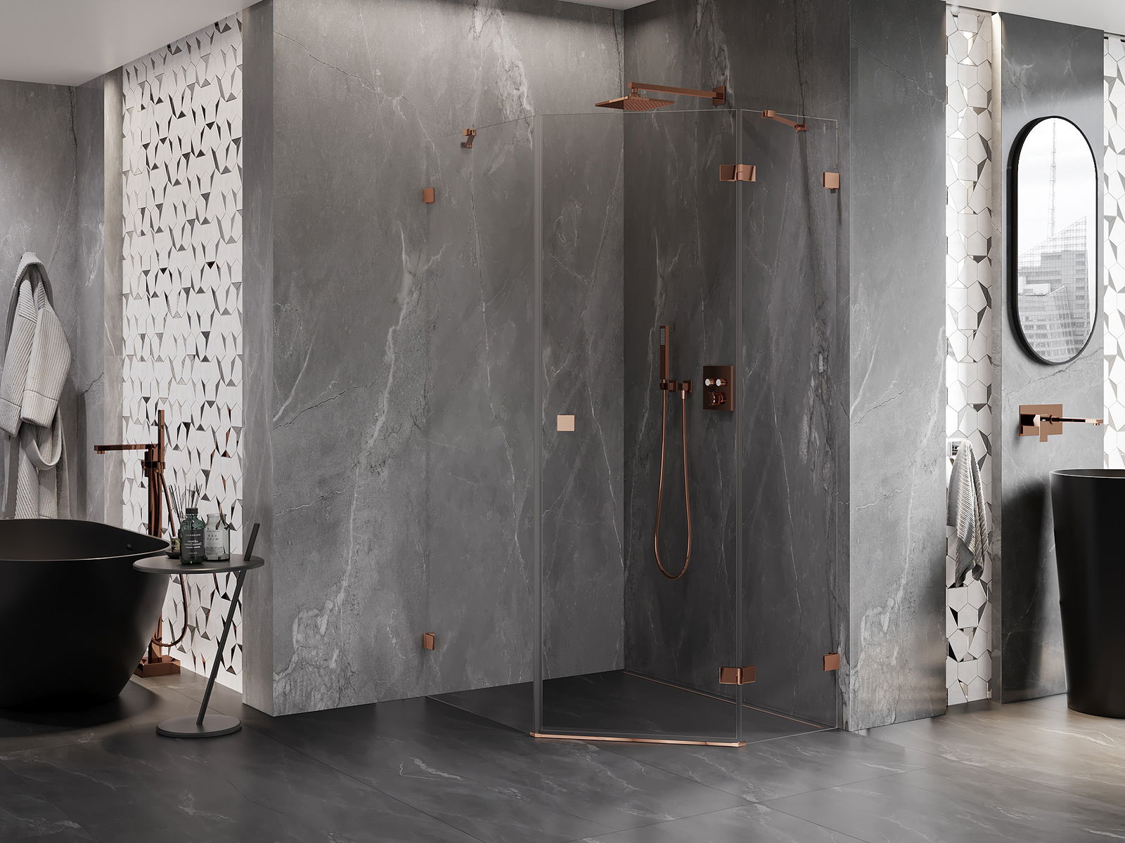 D'Klammen an d'Héngelen goufen aus ganz dauerhafte Messing gemaach, an zousätzlech schafen se eng ausgeglachen Glasfläche. Et ass eng exzellent Wiel, déi Eleganz, Haltbarkeet an modernen Design verbënnt. Mat esou Léisunge gewënnt d'Dusch un Ästhetik, an gläichzäiteg erliichtert et d'Rengen.