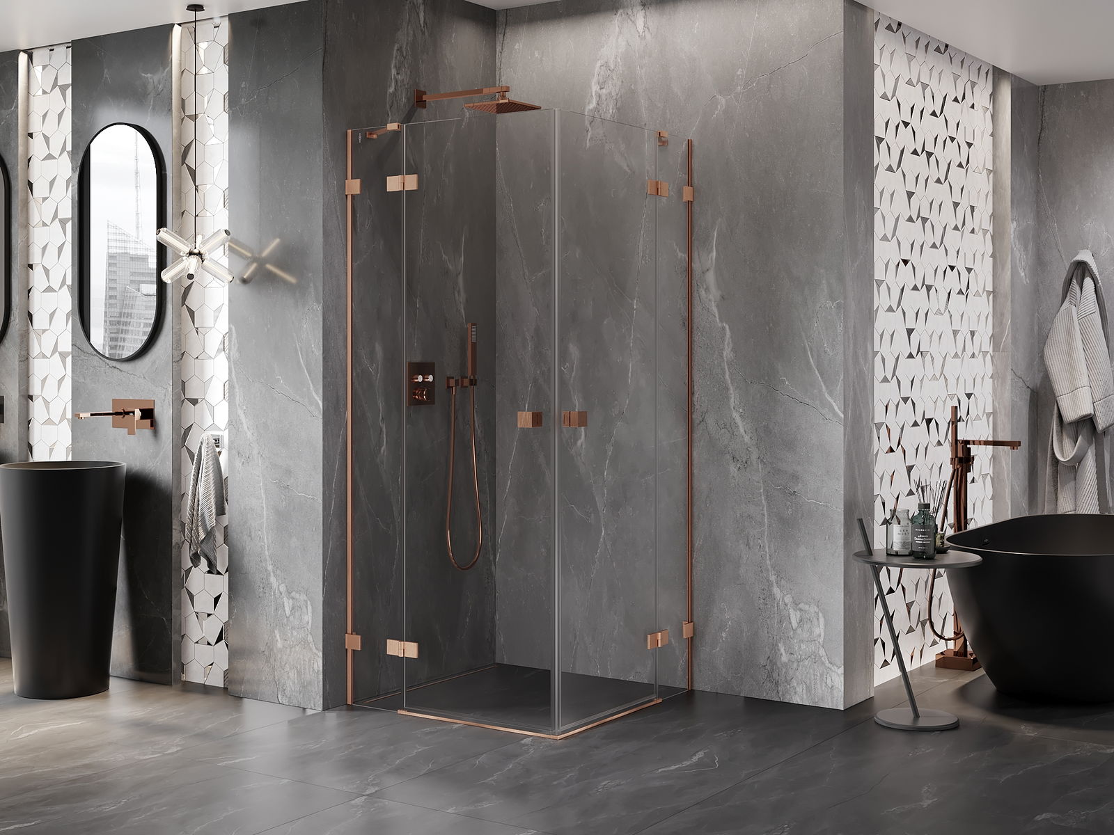D'Klammen an d'Héngelen goufen aus ganz dauerhafte Messing gemaach, an zousätzlech schafen se eng ausgeglachen Glasfläche. Et ass eng exzellent Wiel, déi Eleganz, Haltbarkeet an modernen Design verbënnt. Mat esou Léisunge gewënnt d'Dusch un Ästhetik, an gläichzäiteg erliichtert et d'Rengen.
