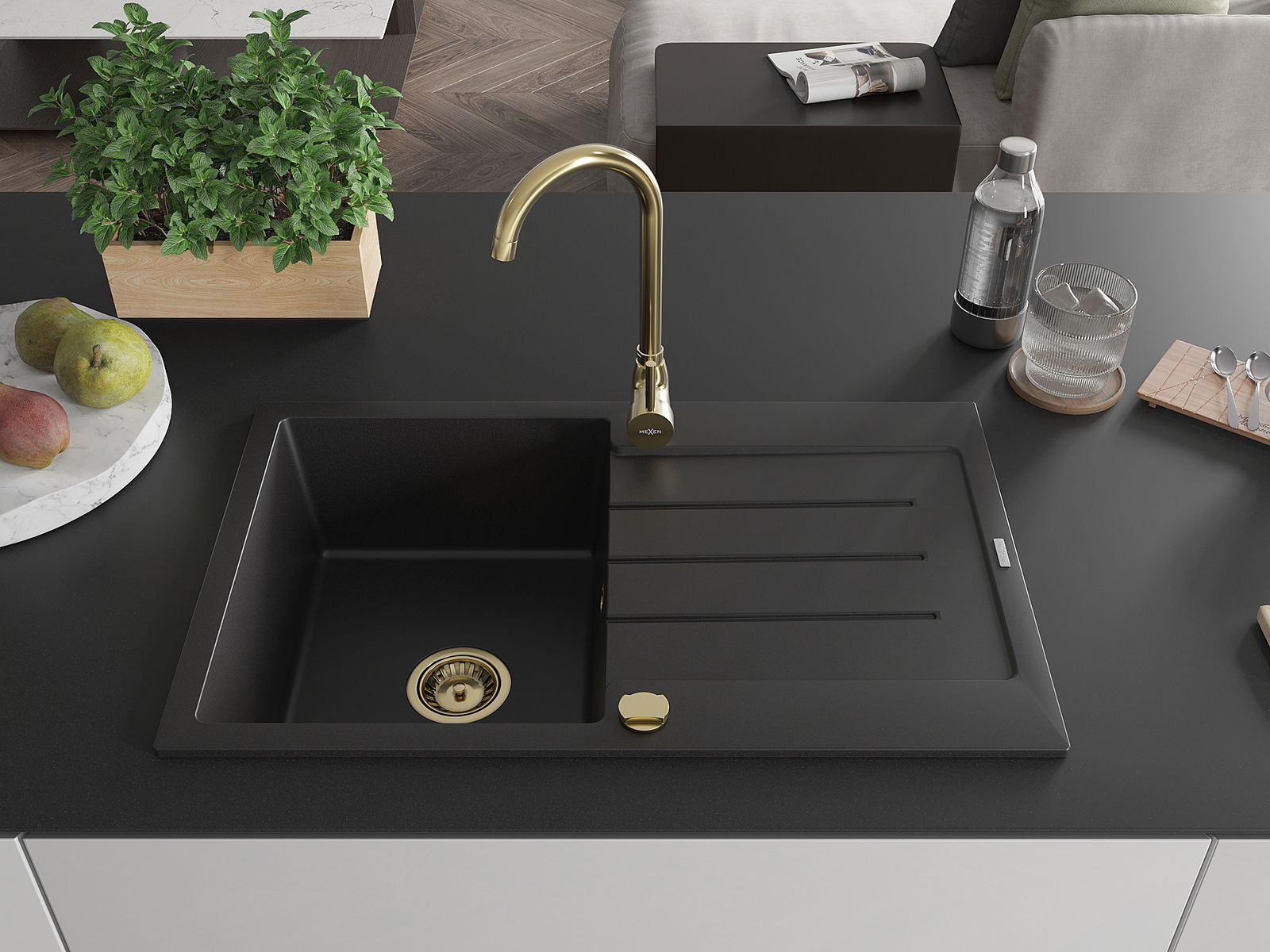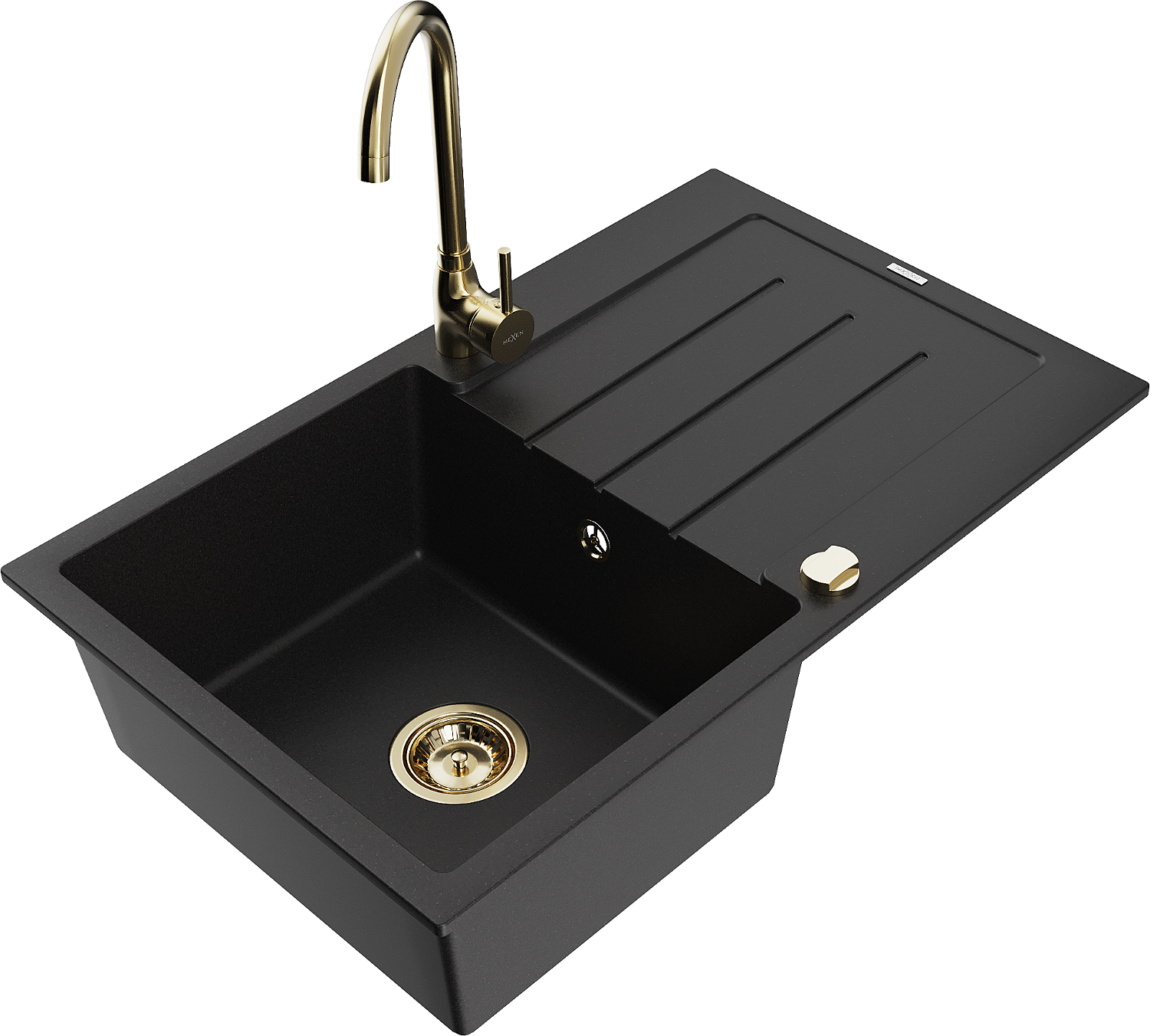 Mexen Bruno Granit Spullsteen mat enger Schoss an enger Kichenbatterie Telma, schwaarz - 6513-77-670200-50