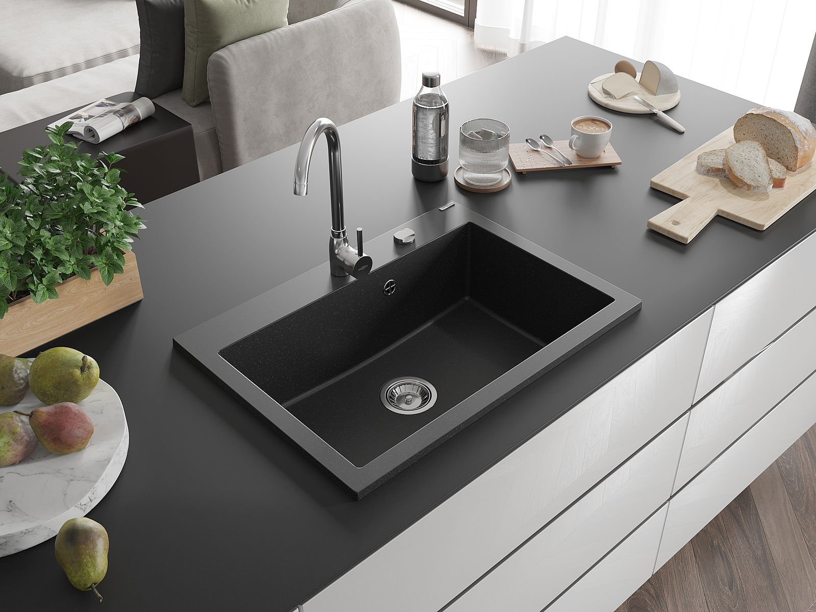 De Spullsteen huet e virgefraist Lach mat engem Duerchmiesser vu 35 mm fir selwer auszeschloen. Et kann ënner anerem genotzt ginn fir e Spender fir Flëssegkeet z'installéieren, deen d'Präsenz vu Plastikfläschen an der Kichen eliminéiert an hir en elegante Finish gëtt.