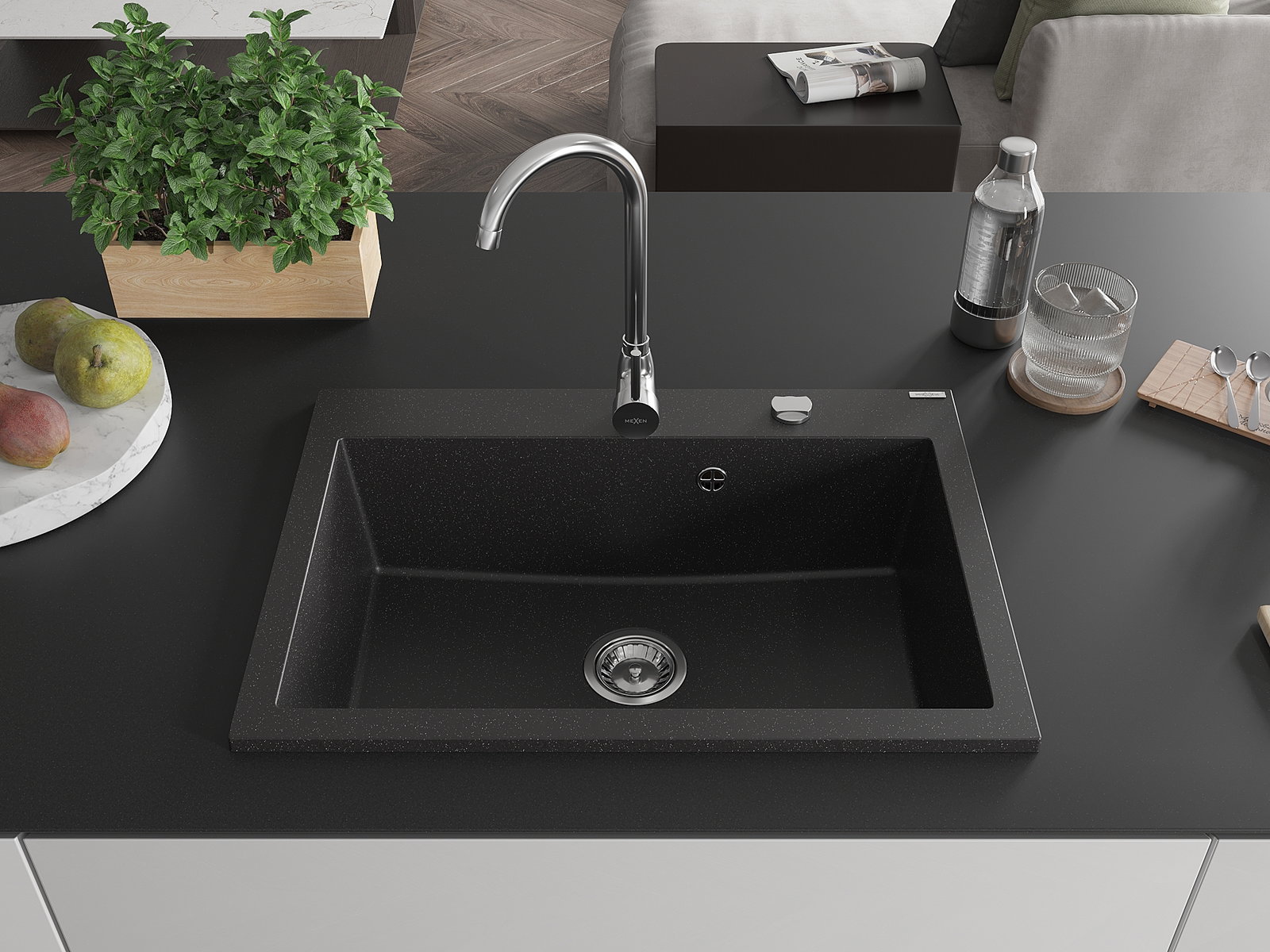 Mexen Elix Granitspullut eenkommer 700 x 500 mm, schwaarz/sëlwermetallik, Chromsyphon - 6526701005-73
