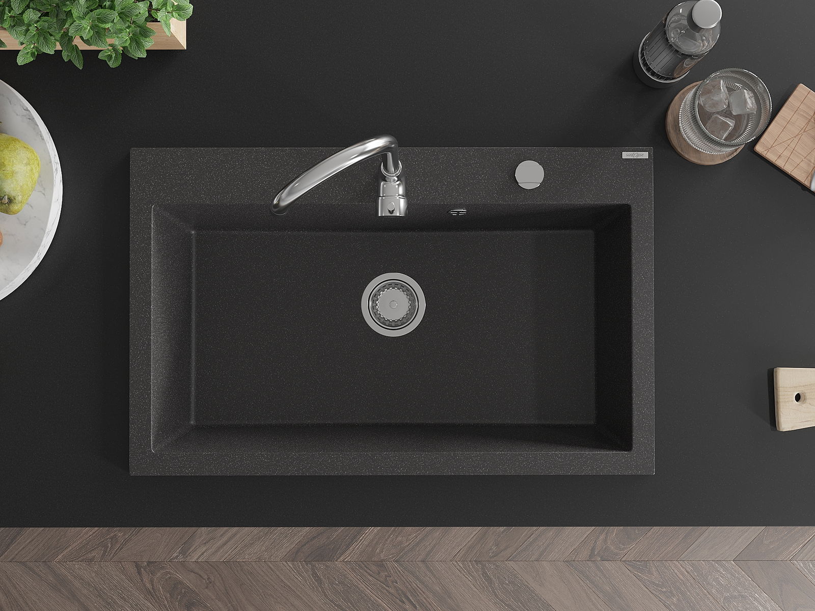 De Spullsteen huet e virgefraist Lach mat engem Duerchmiesser vu 35 mm fir selwer auszeschloen. Et kann ënner anerem genotzt ginn fir e Spender fir Flëssegkeet z'installéieren, deen d'Präsenz vu Plastikfläschen an der Kichen eliminéiert an hir en elegante Finish gëtt.