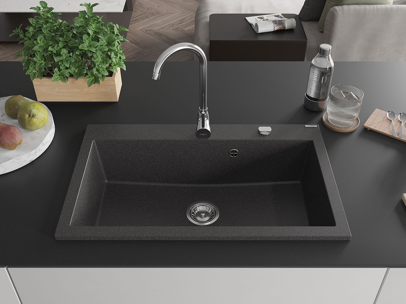 Mexen Elix Granit-Spullstell mat 1-Kummer 800 x 500 mm, schwaarz gesprenkelt, Chrom-Siphon - 6527801005-76