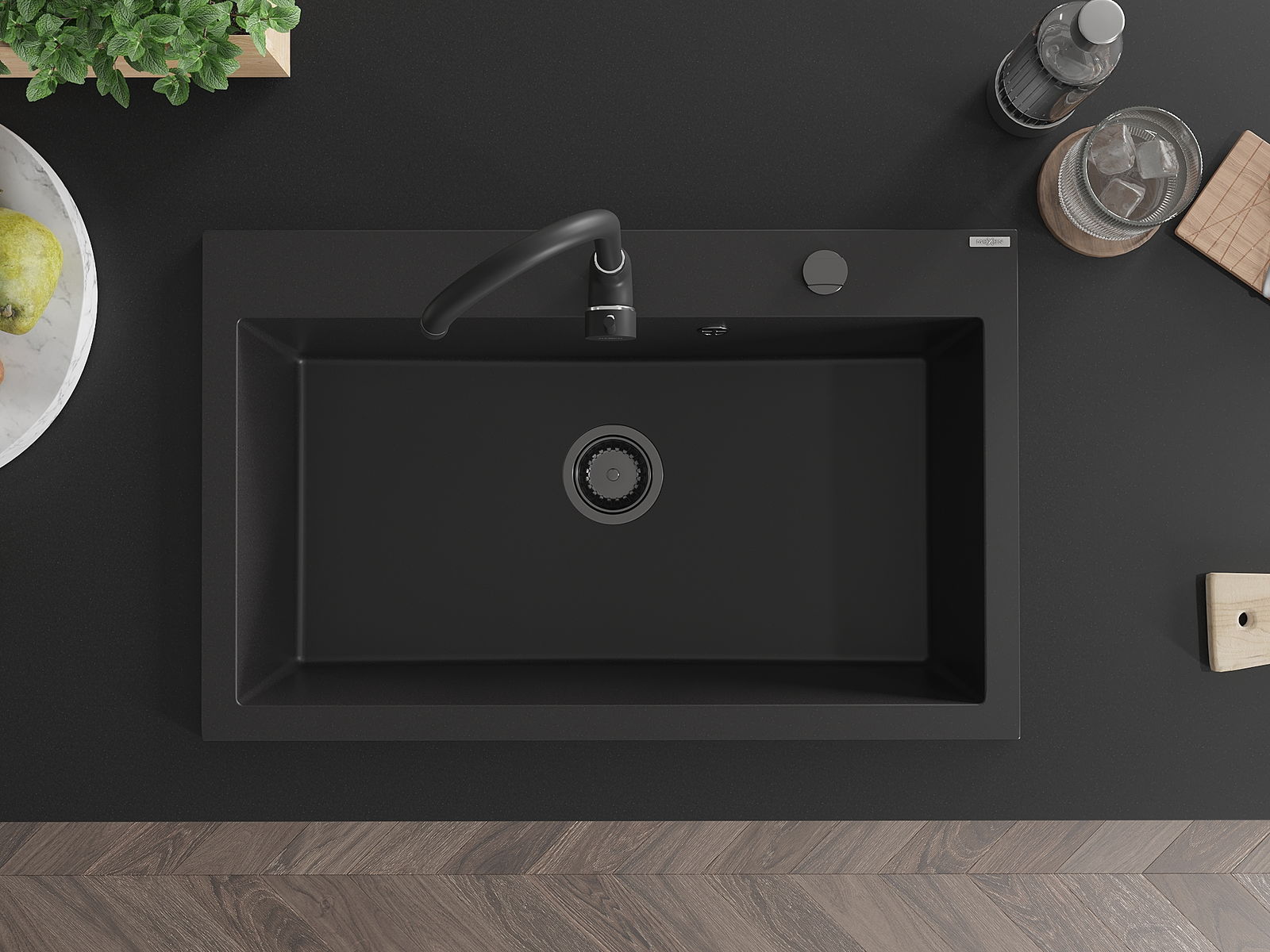 De Spullsteen huet e virgefraist Lach mat engem Duerchmiesser vu 35 mm fir selwer auszeschloen. Et kann ënner anerem genotzt ginn fir e Spender fir Flëssegkeet z'installéieren, deen d'Präsenz vu Plastikfläschen an der Kichen eliminéiert an hir en elegante Finish gëtt.