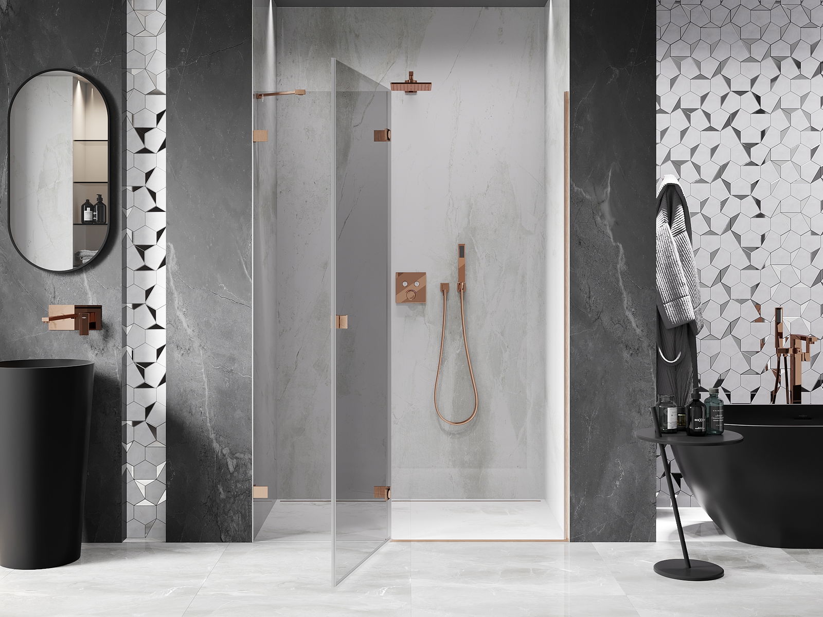 D'Klammen an d'Héngelen goufen aus ganz dauerhafte Messing gemaach, an zousätzlech schafen se eng ausgeglachen Glasfläche. Et ass eng exzellent Wiel, déi Eleganz, Haltbarkeet an modernen Design verbënnt. Mat esou Léisunge gewënnt d'Dusch un Ästhetik, an gläichzäiteg erliichtert et d'Rengen.