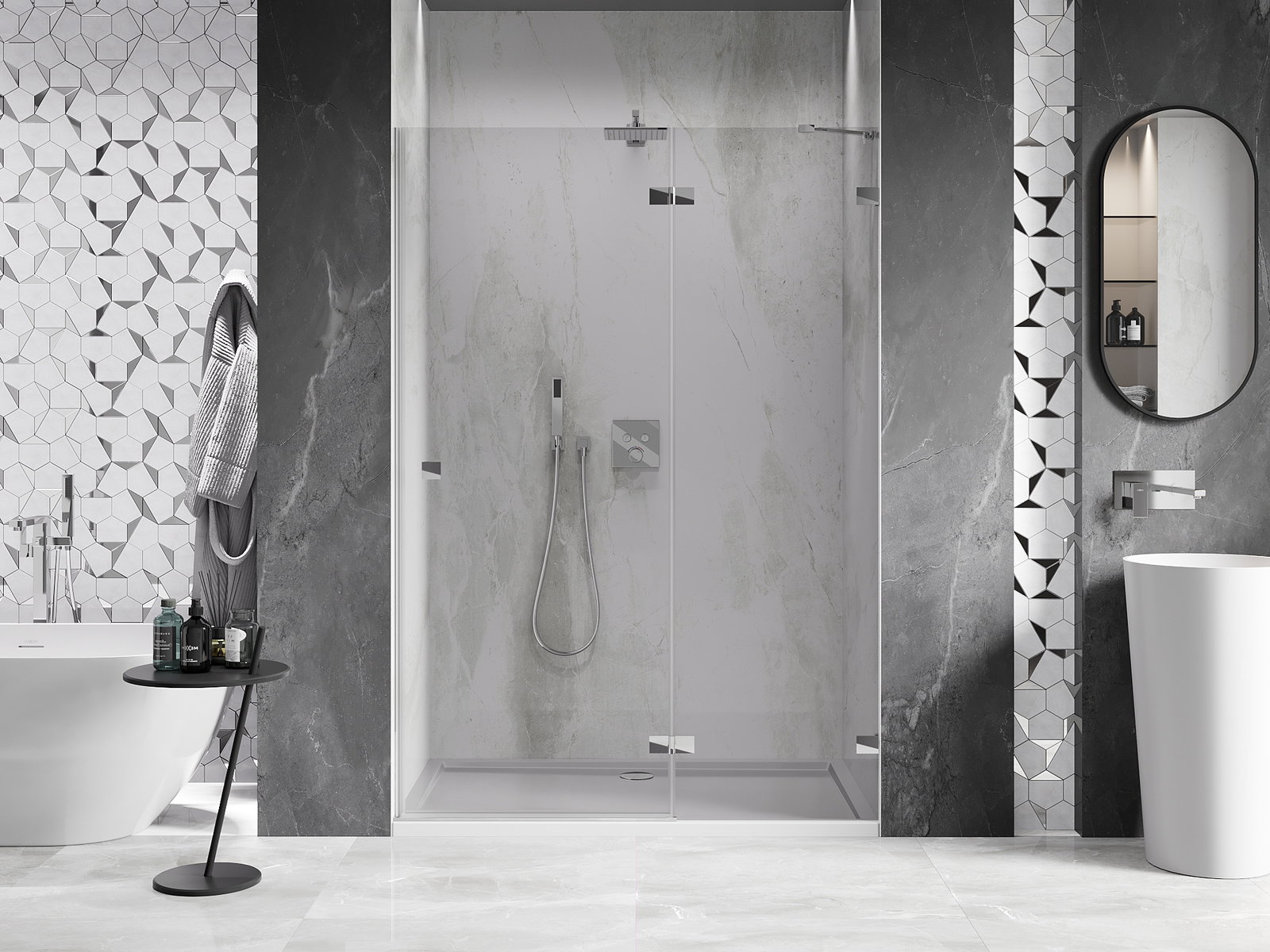 D'Klammen an d'Héngelen goufen aus ganz dauerhafte Messing gemaach, an zousätzlech schafen se eng ausgeglachen Glasfläche. Et ass eng exzellent Wiel, déi Eleganz, Haltbarkeet an modernen Design verbënnt. Mat esou Léisunge gewënnt d'Dusch un Ästhetik, an gläichzäiteg erliichtert et d'Rengen.