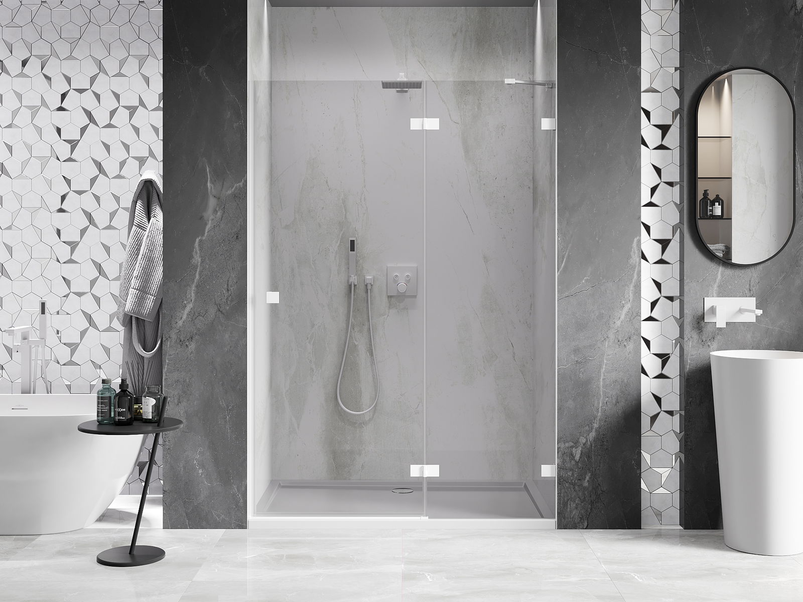 D'Klammen an d'Héngelen goufen aus ganz dauerhafte Messing gemaach, an zousätzlech schafen se eng ausgeglachen Glasfläche. Et ass eng exzellent Wiel, déi Eleganz, Haltbarkeet an modernen Design verbënnt. Mat esou Léisunge gewënnt d'Dusch un Ästhetik, an gläichzäiteg erliichtert et d'Rengen.