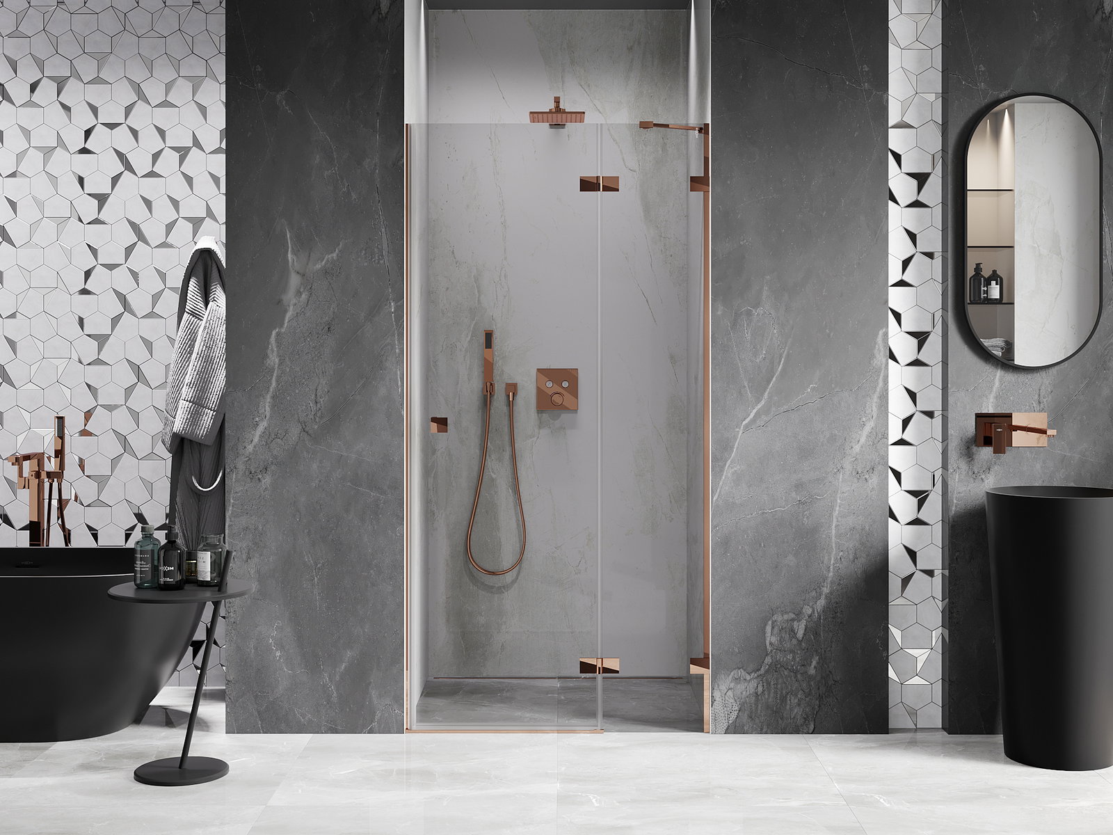 D'Klammen an d'Héngelen goufen aus ganz dauerhafte Messing gemaach, an zousätzlech schafen se eng ausgeglachen Glasfläche. Et ass eng exzellent Wiel, déi Eleganz, Haltbarkeet an modernen Design verbënnt. Mat esou Léisunge gewënnt d'Dusch un Ästhetik, an gläichzäiteg erliichtert et d'Rengen.