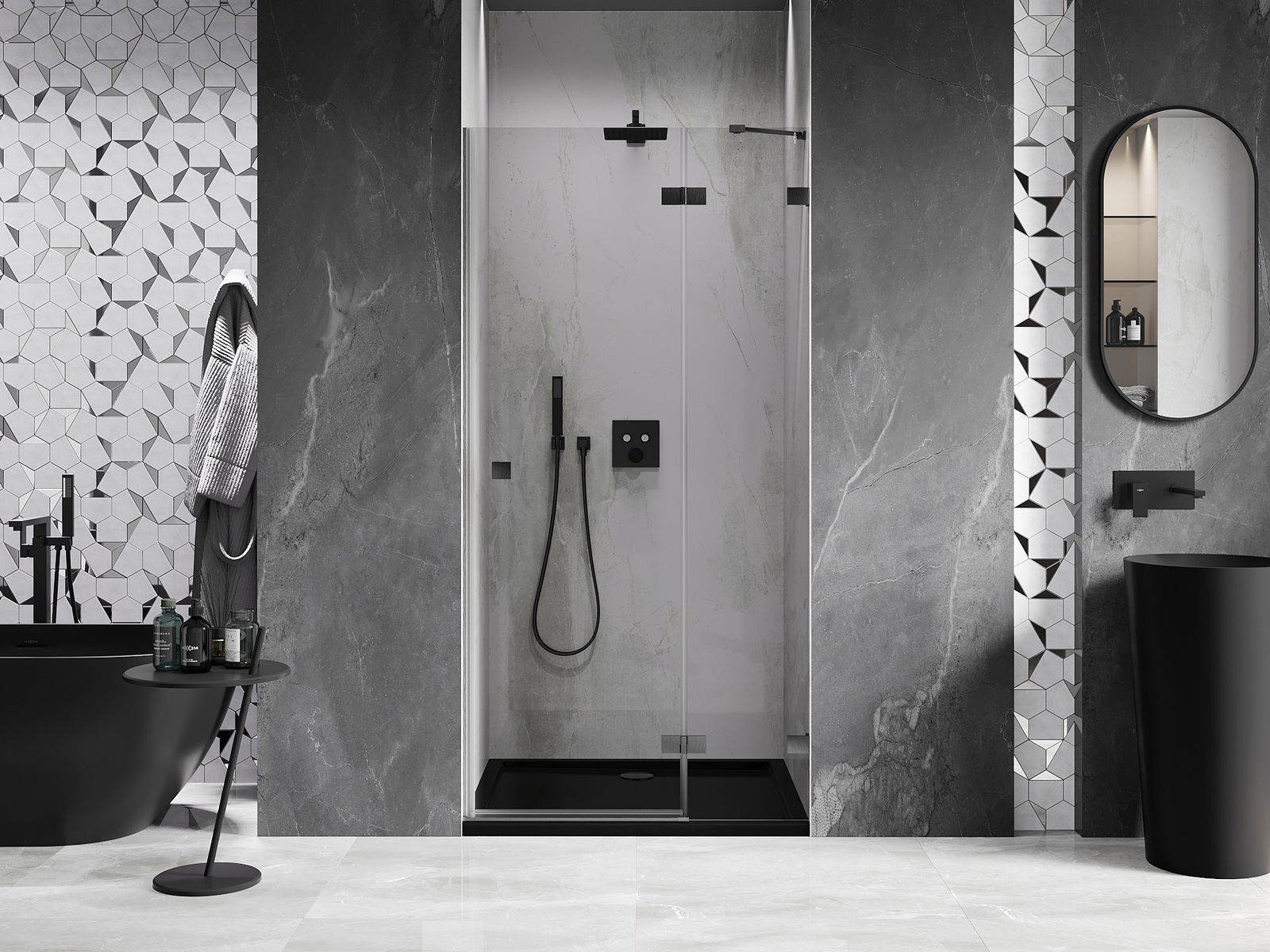 D'Klammen an d'Héngelen goufen aus ganz dauerhafte Messing gemaach, an zousätzlech schafen se eng ausgeglachen Glasfläche. Et ass eng exzellent Wiel, déi Eleganz, Haltbarkeet an modernen Design verbënnt. Mat esou Léisunge gewënnt d'Dusch un Ästhetik, an gläichzäiteg erliichtert et d'Rengen.