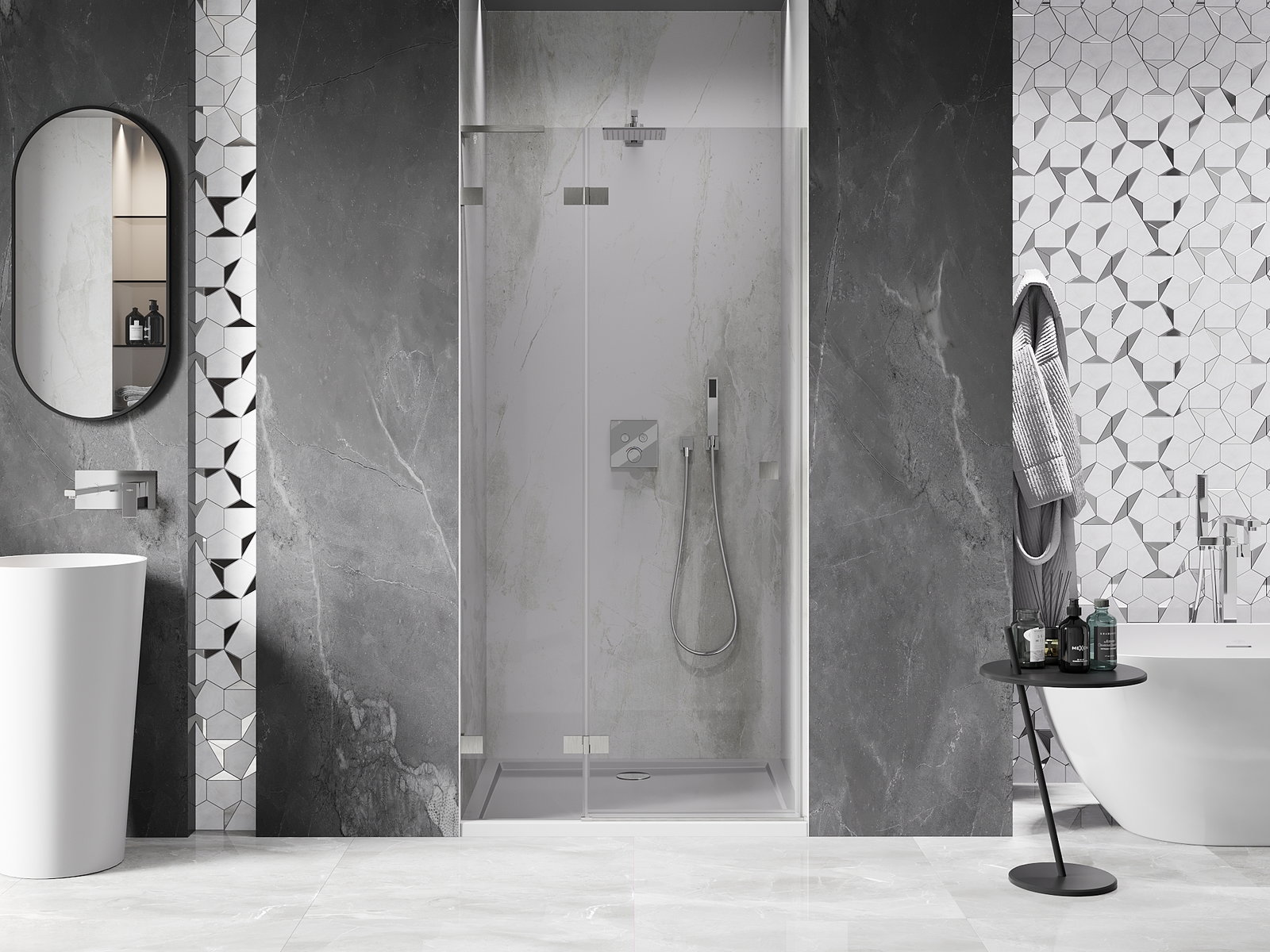 D'Klammen an d'Héngelen goufen aus ganz dauerhafte Messing gemaach, an zousätzlech schafen se eng ausgeglachen Glasfläche. Et ass eng exzellent Wiel, déi Eleganz, Haltbarkeet an modernen Design verbënnt. Mat esou Léisunge gewënnt d'Dusch un Ästhetik, an gläichzäiteg erliichtert et d'Rengen.