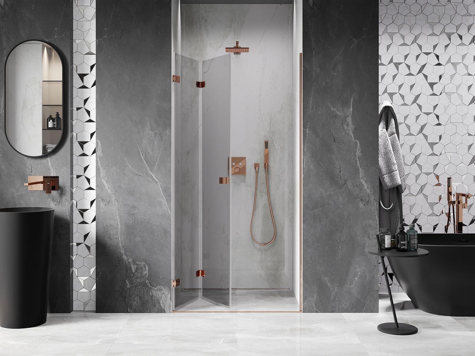 D'Klammen an d'Héngelen goufen aus ganz dauerhafte Messing gemaach, an zousätzlech schafen se eng ausgeglachen Glasfläche. Et ass eng exzellent Wiel, déi Eleganz, Haltbarkeet an modernen Design verbënnt. Mat esou Léisunge gewënnt d'Dusch un Ästhetik, an gläichzäiteg erliichtert et d'Rengen.