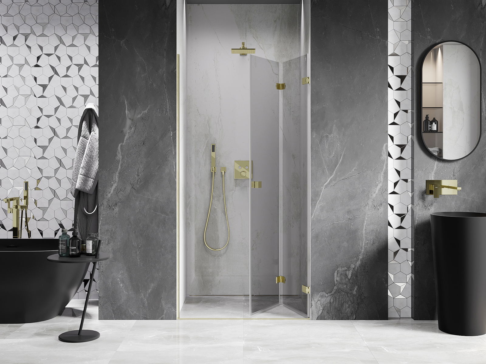 D'Klammen an d'Héngelen goufen aus ganz dauerhafte Messing gemaach, an zousätzlech schafen se eng ausgeglachen Glasfläche. Et ass eng exzellent Wiel, déi Eleganz, Haltbarkeet an modernen Design verbënnt. Mat esou Léisunge gewënnt d'Dusch un Ästhetik, an gläichzäiteg erliichtert et d'Rengen.