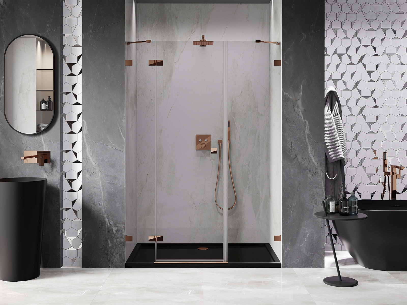 D'Klammen an d'Héngelen goufen aus ganz dauerhafte Messing gemaach, an zousätzlech schafen se eng ausgeglachen Glasfläche. Et ass eng exzellent Wiel, déi Eleganz, Haltbarkeet an modernen Design verbënnt. Mat esou Léisunge gewënnt d'Dusch un Ästhetik, an gläichzäiteg erliichtert et d'Rengen.