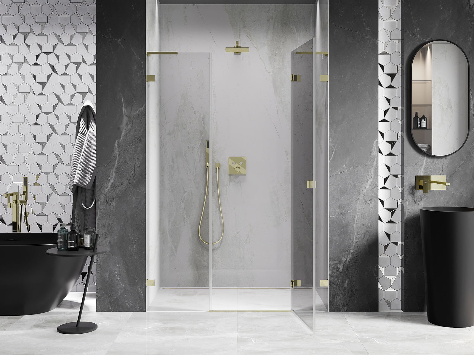 D'Klammen an d'Héngelen goufen aus ganz dauerhafte Messing gemaach, an zousätzlech schafen se eng ausgeglachen Glasfläche. Et ass eng exzellent Wiel, déi Eleganz, Haltbarkeet an modernen Design verbënnt. Mat esou Léisunge gewënnt d'Dusch un Ästhetik, an gläichzäiteg erliichtert et d'Rengen.