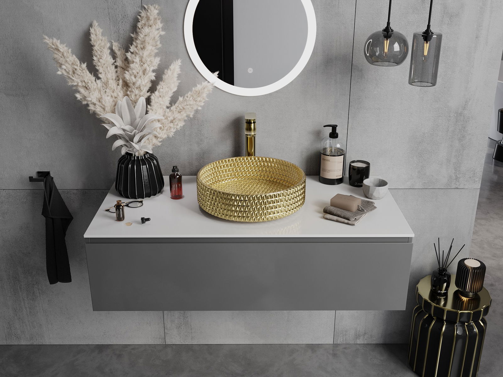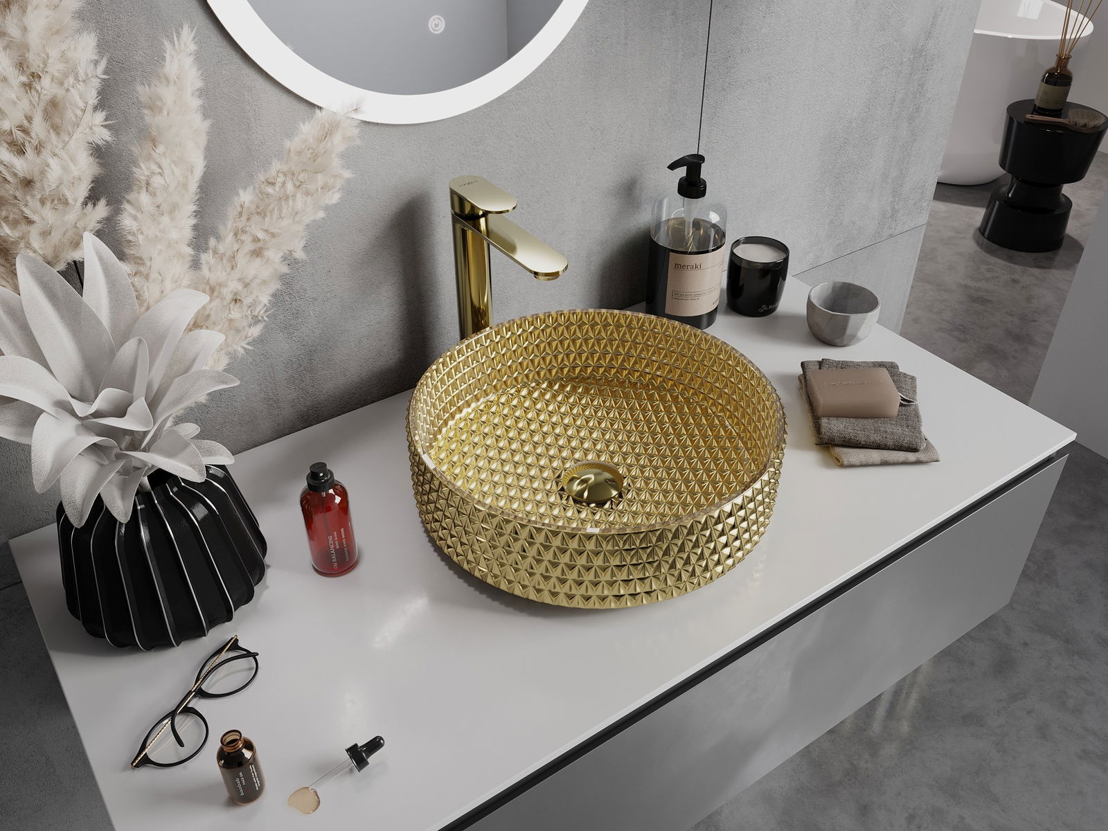 D'Wuechtbecken huet eng aussergewéinlech Kristallstruktur, déi him e einzigartigen an immens impressionanten Ausgesinn gëtt. D'Kristaller blénken am Liicht, fänken d'Aen op a ginn Eleganz. Eng praktesch a stilvoll Léisung fir all Buedzëmmer.