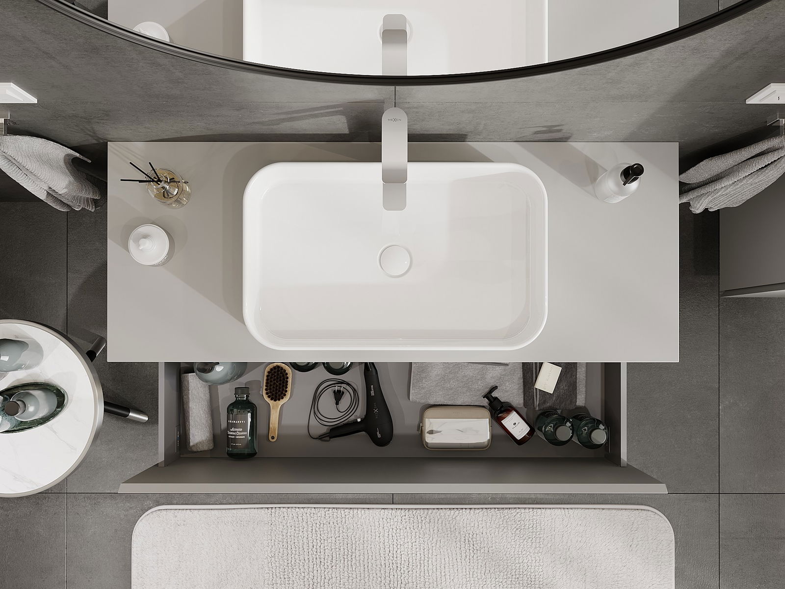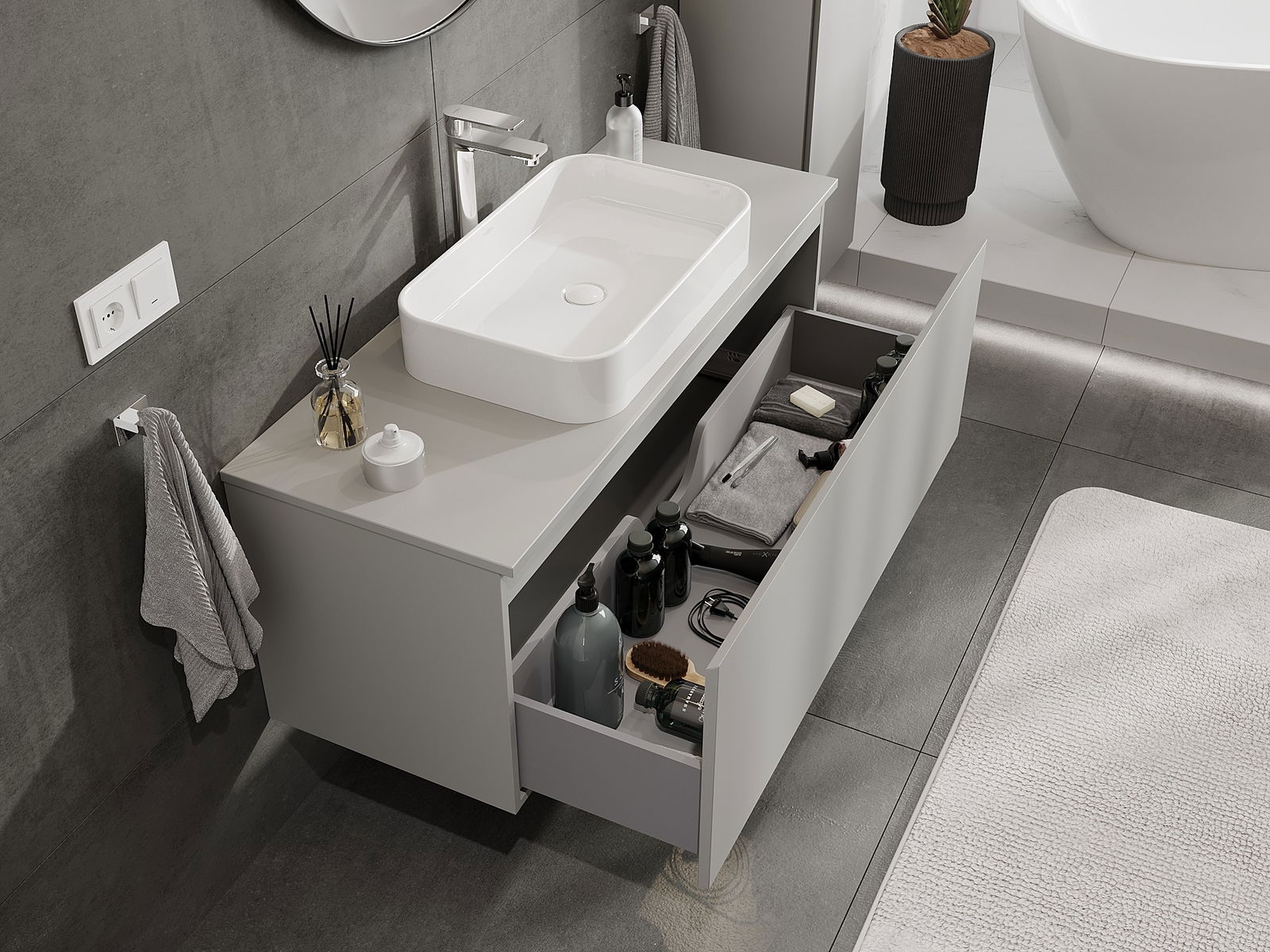 Dank de robuste Materialien, der preziser Ausféierung an den modernen technologesche Léisungen, bitt de Produit Komfort beim Gebrauch, Widderstandsfäegkeet géint Fiichtegkeet a Temperaturännerungen, wéi och en elegante Look, deen zu verschiddene Buedzëmmerstiler passt.