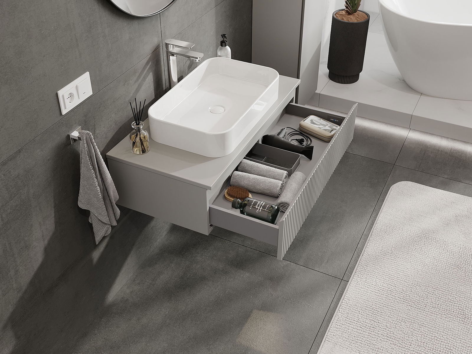 De Cabinetkierper gëtt komplett zesummegebaut geliwwert, wat maximalen Komfort a Zäitspuer bedeit. Du muss keng Stonnen domat verbréngen de Miwwel zesummenzebauen – einfach an der gewielter Plaz am Buedzëmmer montéieren. Et ass déi ideal Léisung fir Leit, déi séier Montage an en direkten Effekt schätzen.