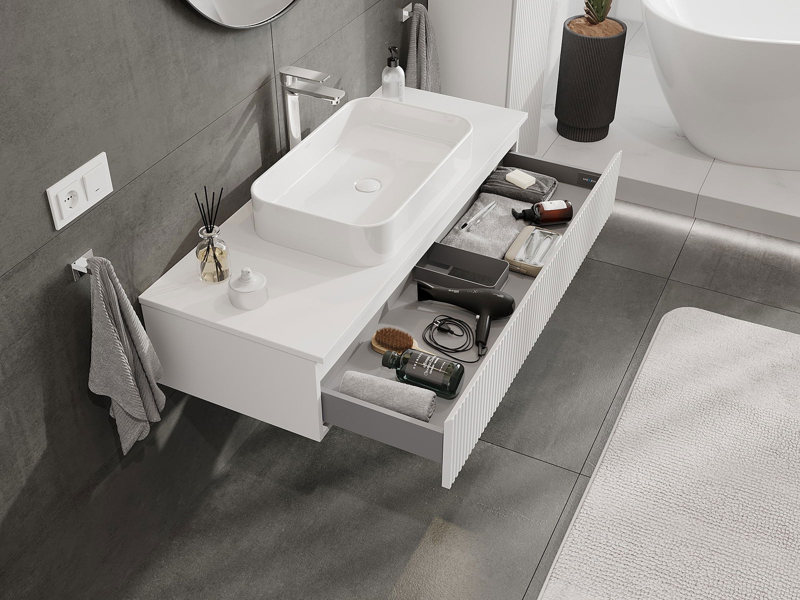 Dank de robuste Materialien, der preziser Ausféierung an den modernen technologesche Léisungen, bitt de Produit Komfort beim Gebrauch, Widderstandsfäegkeet géint Fiichtegkeet a Temperaturännerungen, wéi och en elegante Look, deen zu verschiddene Buedzëmmerstiler passt.