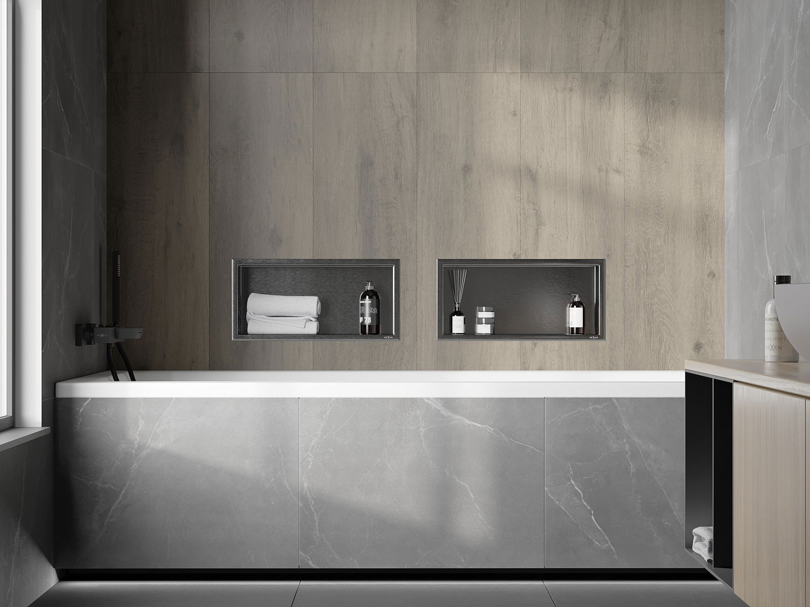 Méiglechkeet fir an der Mauer oder an enger speziell vorbereiten Déposée ze montéieren. Et ass eng extrem modern an funktionell Léisung, déi Plaz spuere léisst an de Produit un d'Esthetik vun den Interieur upassen an eng zesummegepasst Kompositioun schafen.
