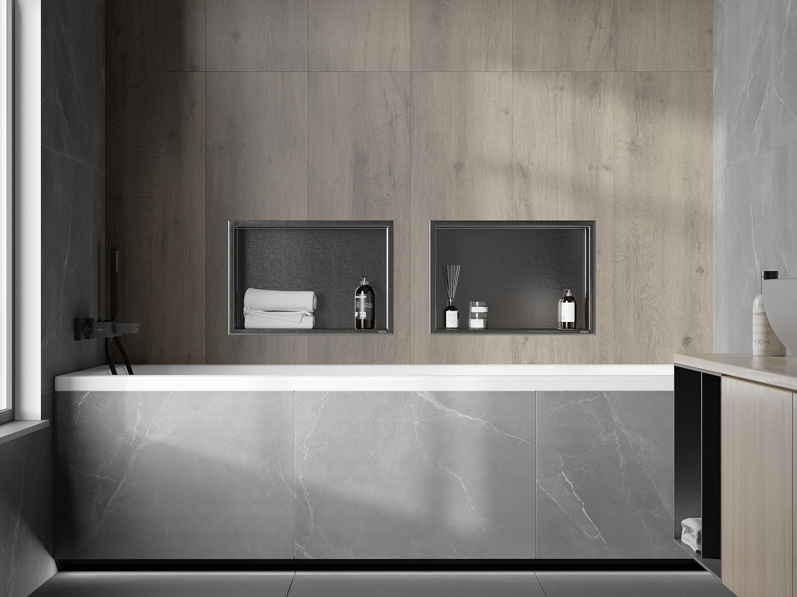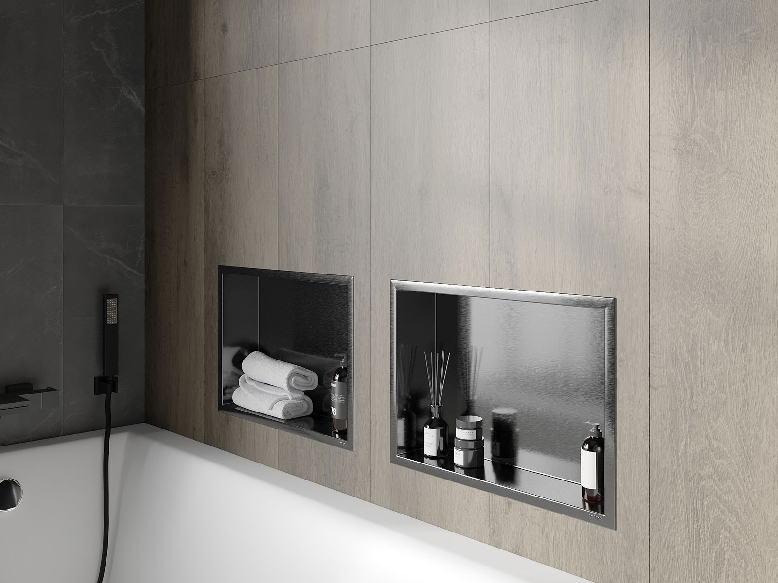 Méiglechkeet fir an der Mauer oder an enger speziell vorbereiten Déposée ze montéieren. Et ass eng extrem modern an funktionell Léisung, déi Plaz spuere léisst an de Produit un d'Esthetik vun den Interieur upassen an eng zesummegepasst Kompositioun schafen.