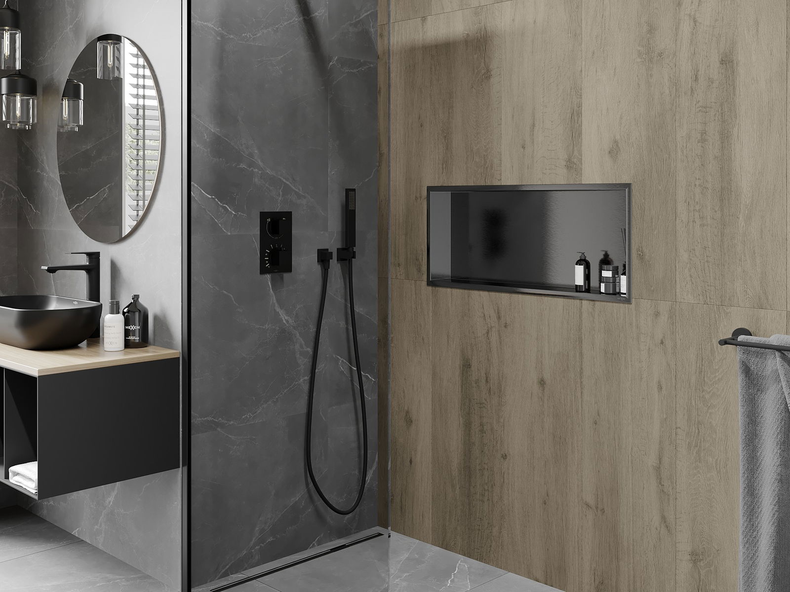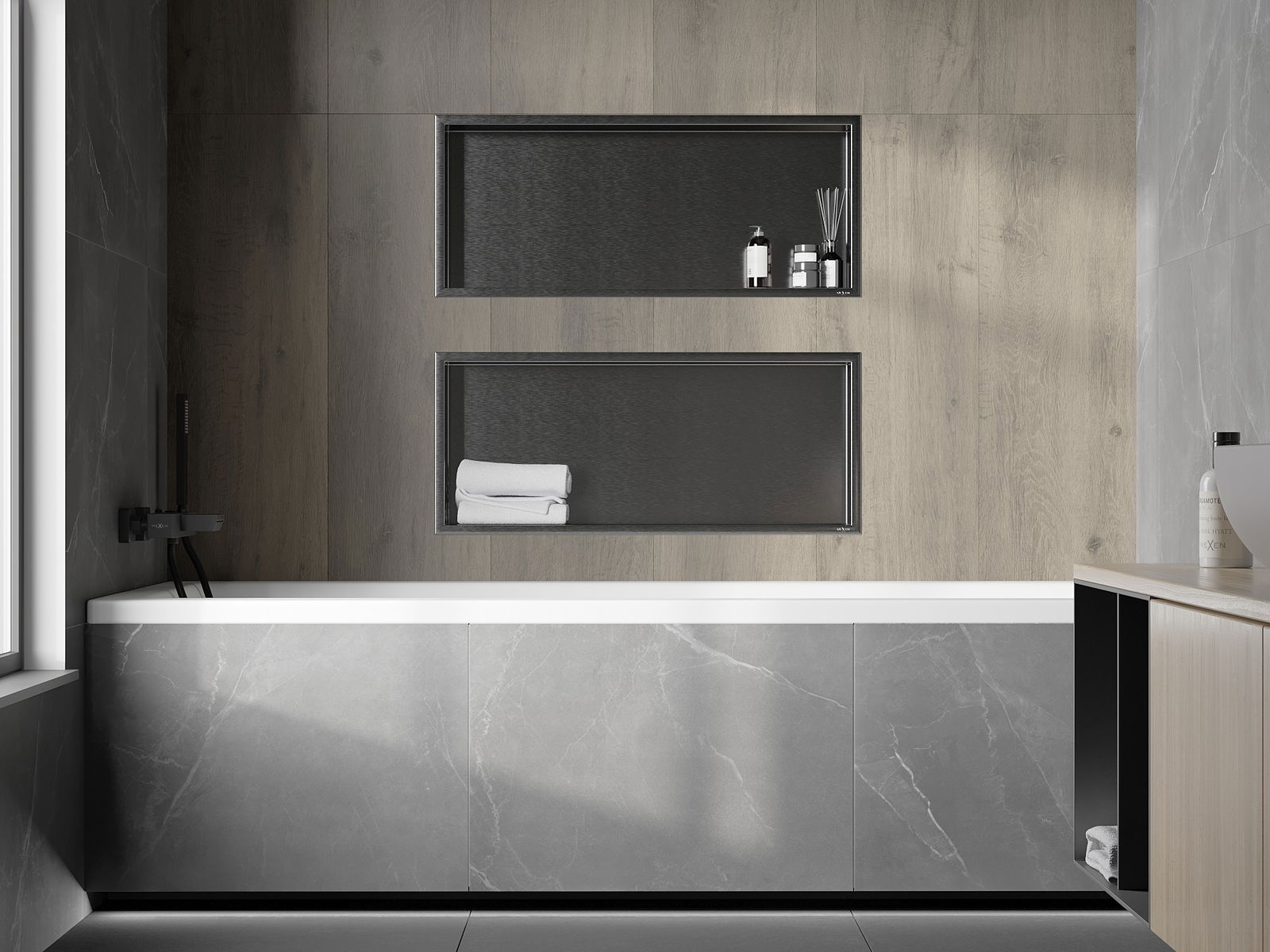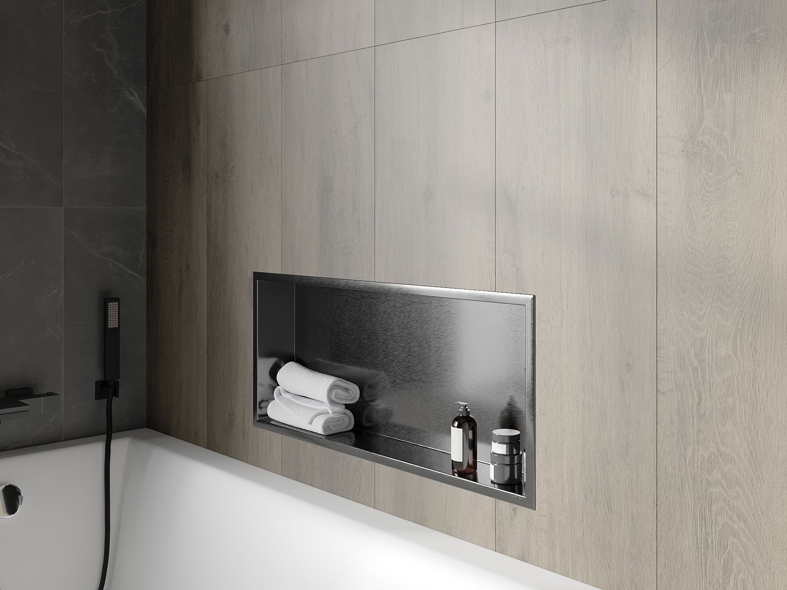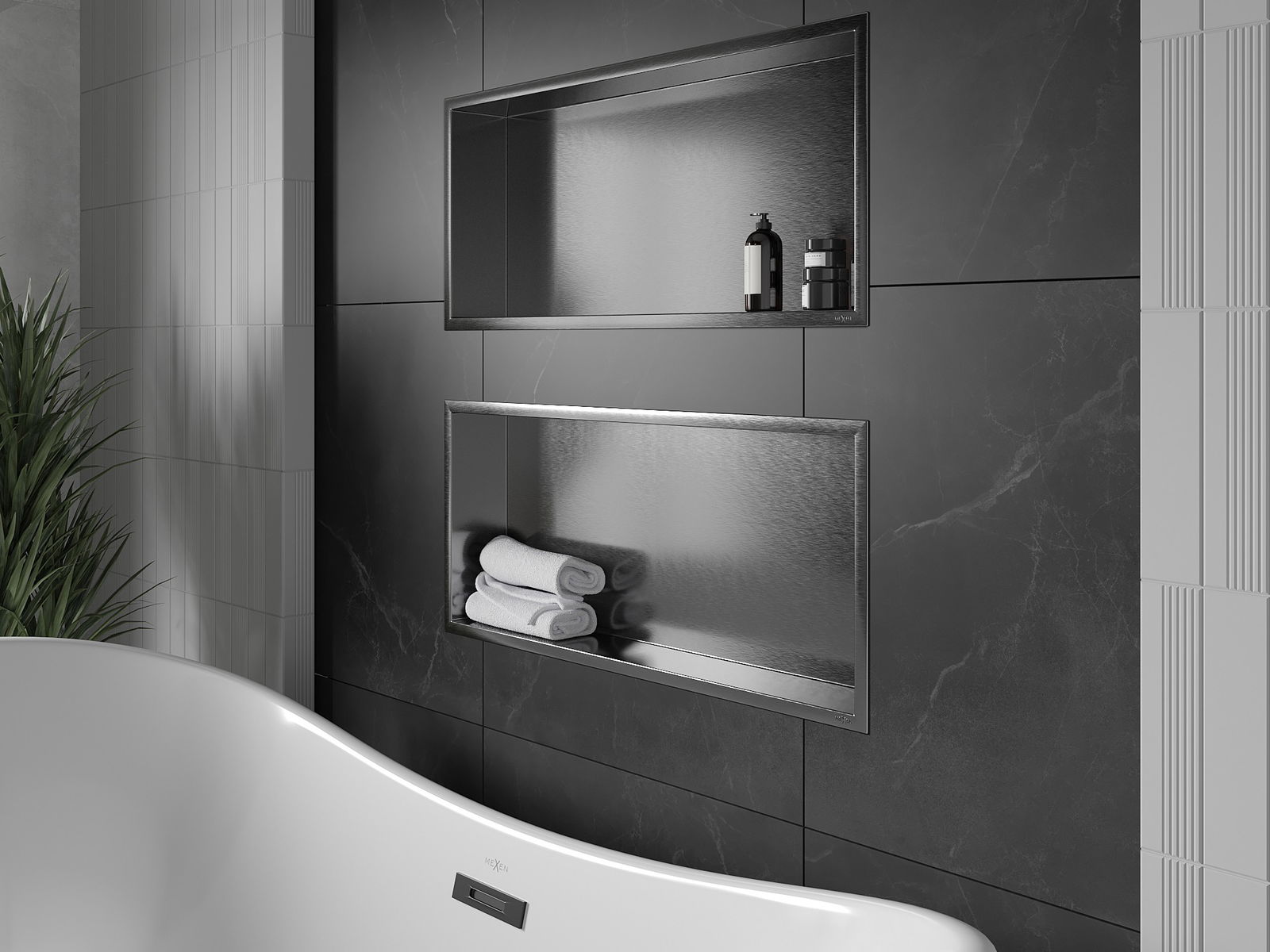Méiglechkeet fir an der Mauer oder an enger speziell vorbereiten Déposée ze montéieren. Et ass eng extrem modern an funktionell Léisung, déi Plaz spuere léisst an de Produit un d'Esthetik vun den Interieur upassen an eng zesummegepasst Kompositioun schafen.