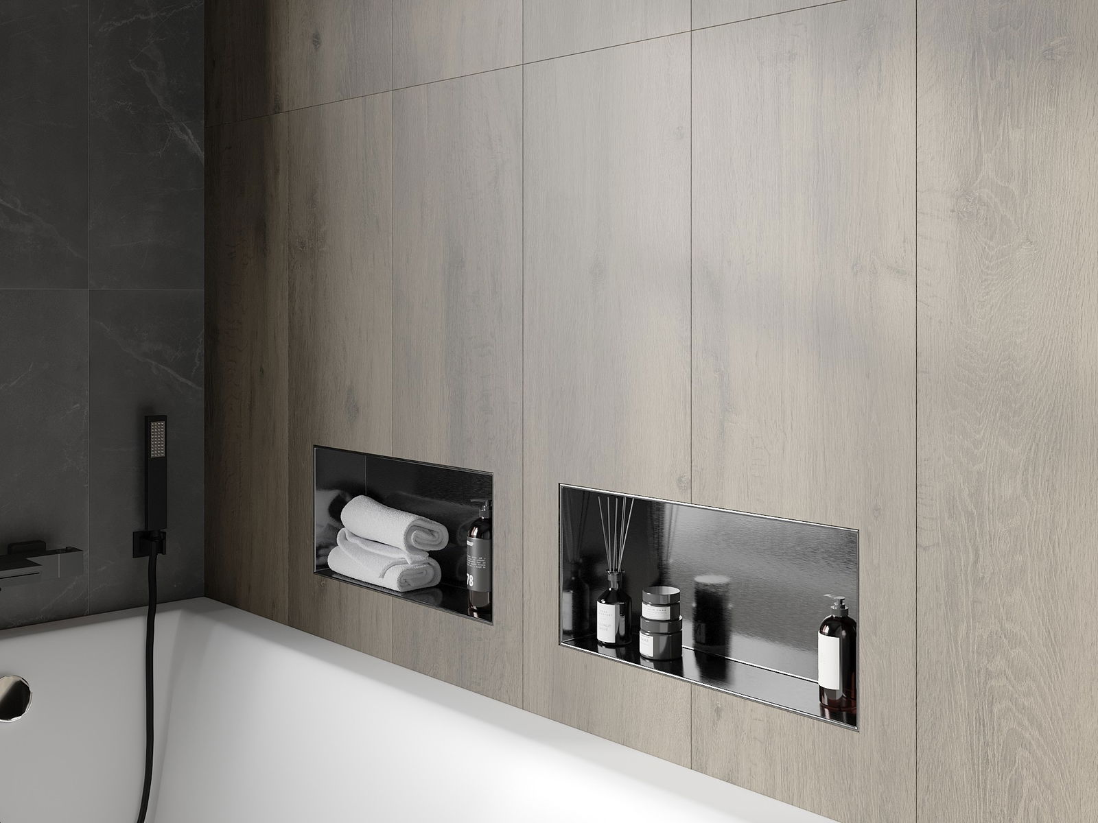 Méiglechkeet fir an der Mauer oder an enger speziell vorbereiten Déposée ze montéieren. Et ass eng extrem modern an funktionell Léisung, déi Plaz spuere léisst an de Produit un d'Esthetik vun den Interieur upassen an eng zesummegepasst Kompositioun schafen.