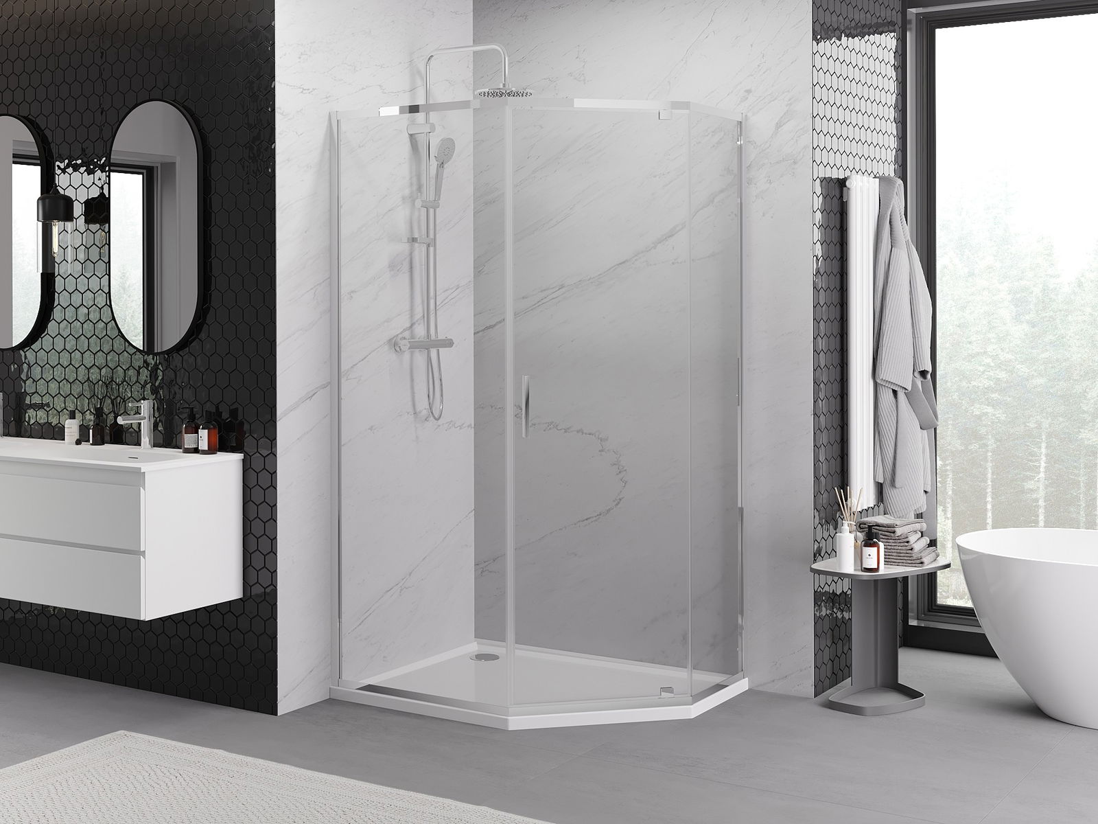 Dank dem universelle Montagesystem kënnen d'Duschdieren op der lénker oder op der rietser Säit montéiert ginn, ofhängeg vun de Besoinen. Duerch dëst kënns du de Buedzëmmer-Dusch mat Liichtegkeet un de Raum upassen.