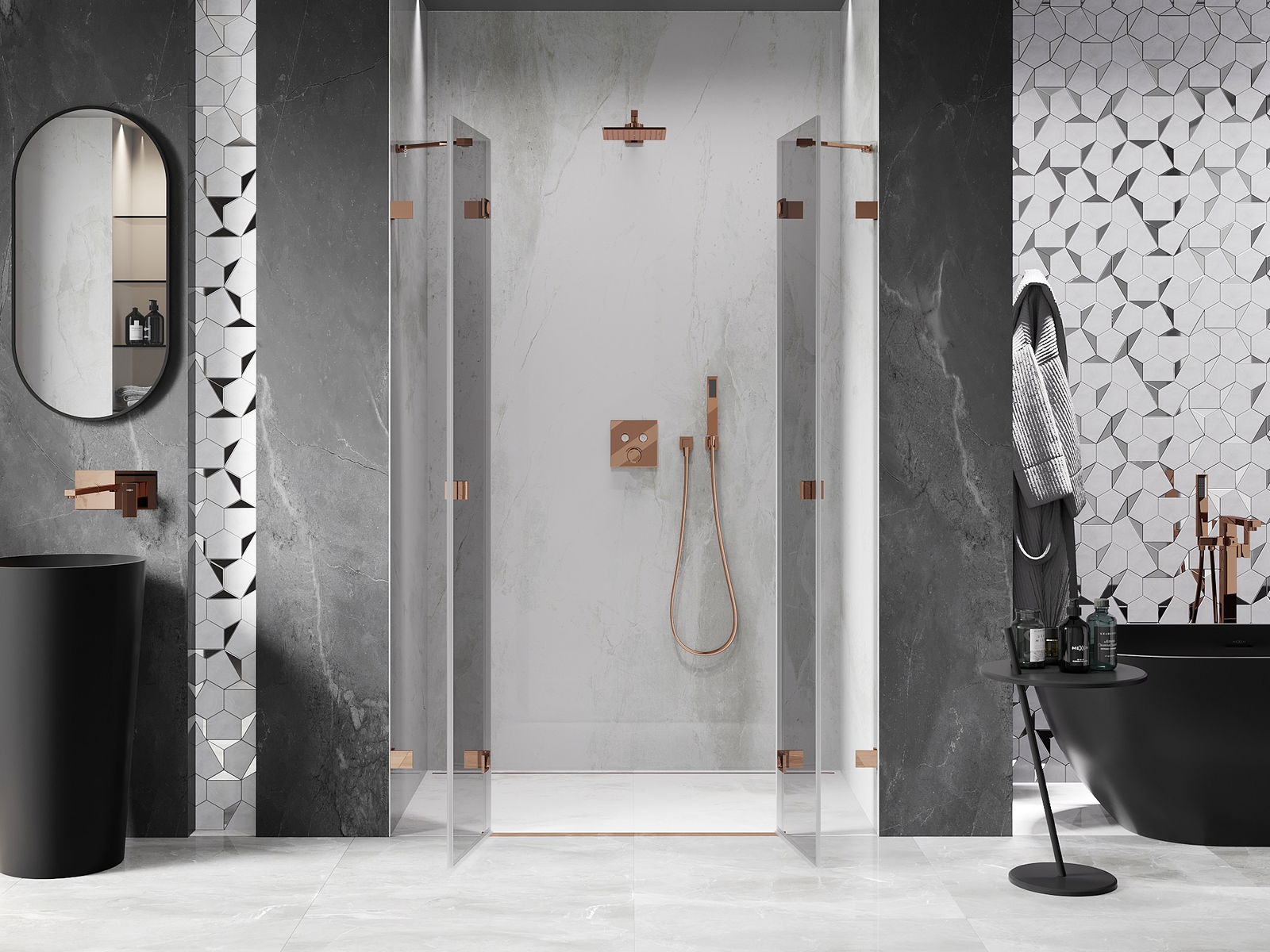 D'Klammen an d'Héngelen goufen aus ganz dauerhafte Messing gemaach, an zousätzlech schafen se eng ausgeglachen Glasfläche. Et ass eng exzellent Wiel, déi Eleganz, Haltbarkeet an modernen Design verbënnt. Mat esou Léisunge gewënnt d'Dusch un Ästhetik, an gläichzäiteg erliichtert et d'Rengen.