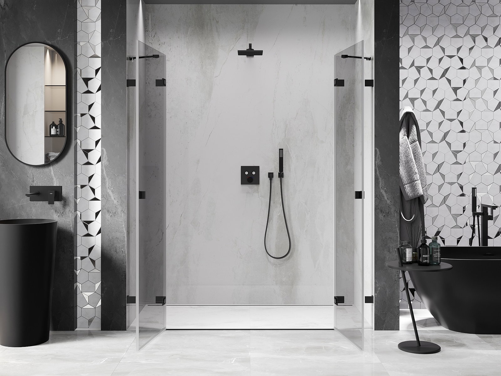 D'Klammen an d'Héngelen goufen aus ganz dauerhafte Messing gemaach, an zousätzlech schafen se eng ausgeglachen Glasfläche. Et ass eng exzellent Wiel, déi Eleganz, Haltbarkeet an modernen Design verbënnt. Mat esou Léisunge gewënnt d'Dusch un Ästhetik, an gläichzäiteg erliichtert et d'Rengen.