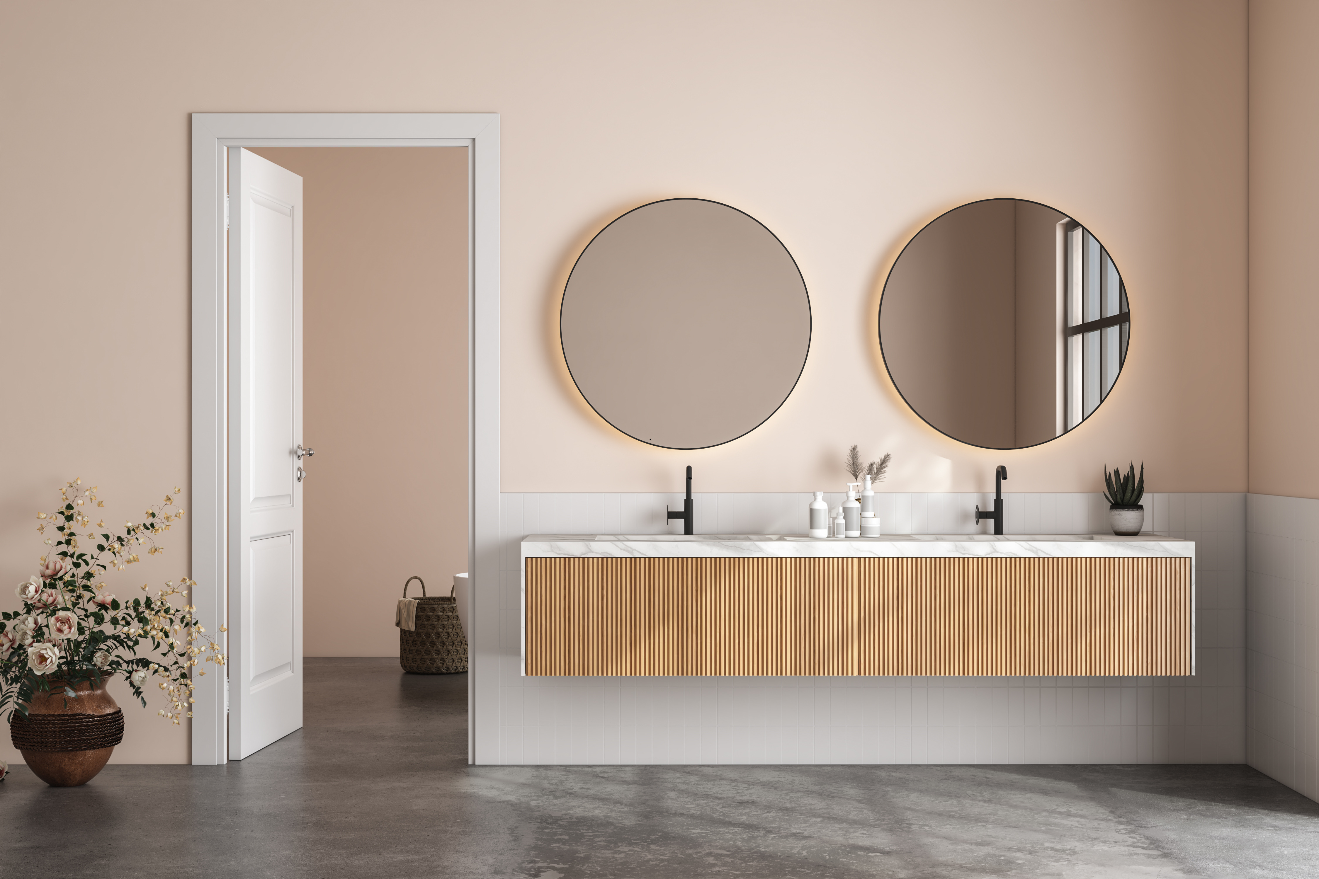In limited space, cabinetry with mirror-front are practical solutions, especially in small rooms, and mini, round mirrors.